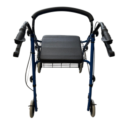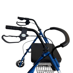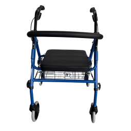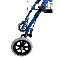 Andador fabricado en aluminio, con ruedas delanteras bidireccionales de 6 pulgadas que permiten un movimiento suave y controlado tanto hacia adelante como hacia atrás.