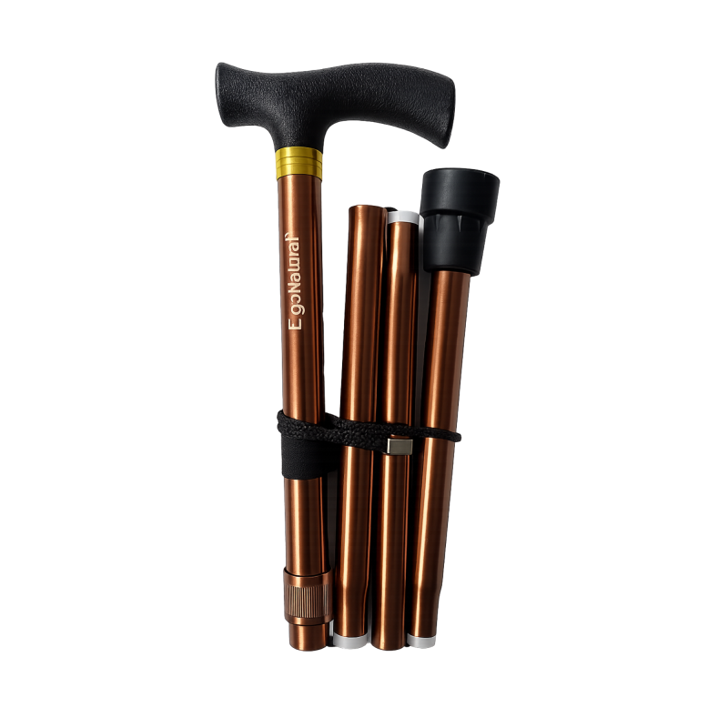 Bastón plegable de aluminio con mango de poliamida expandida, color marrón, combina durabilidad y estilo.