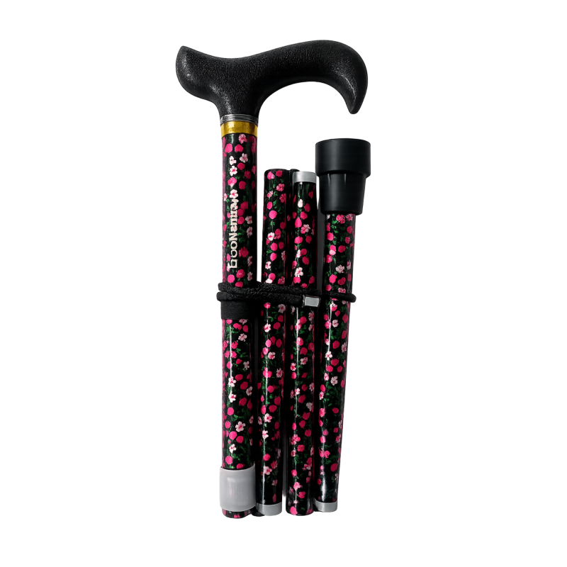 Bastón plegable de aluminio con mango de poliamida expandida, color negro-rojo floreado, combina durabilidad y estilo.