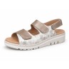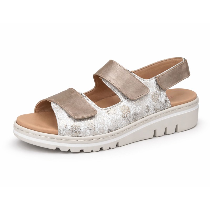 Sandalia de cuña para mujer fabricada en combinación de piel lisa efecto metalizado y estampado.