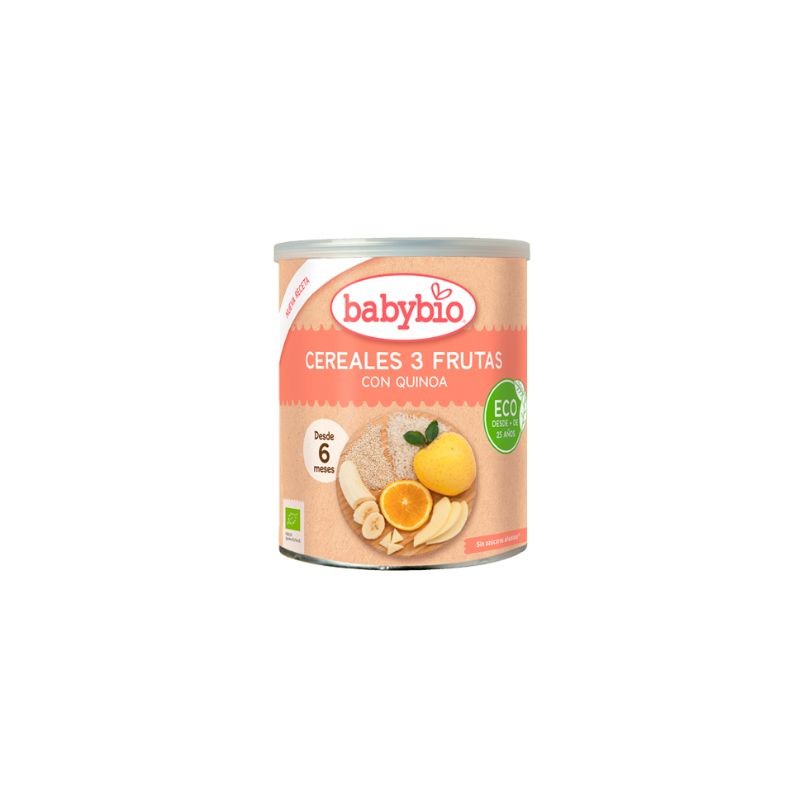 Cereales de 3 frutas con quinoa ecológico; de plátano, naranja y pera, todo procedente de agricultura 100% ecológica.