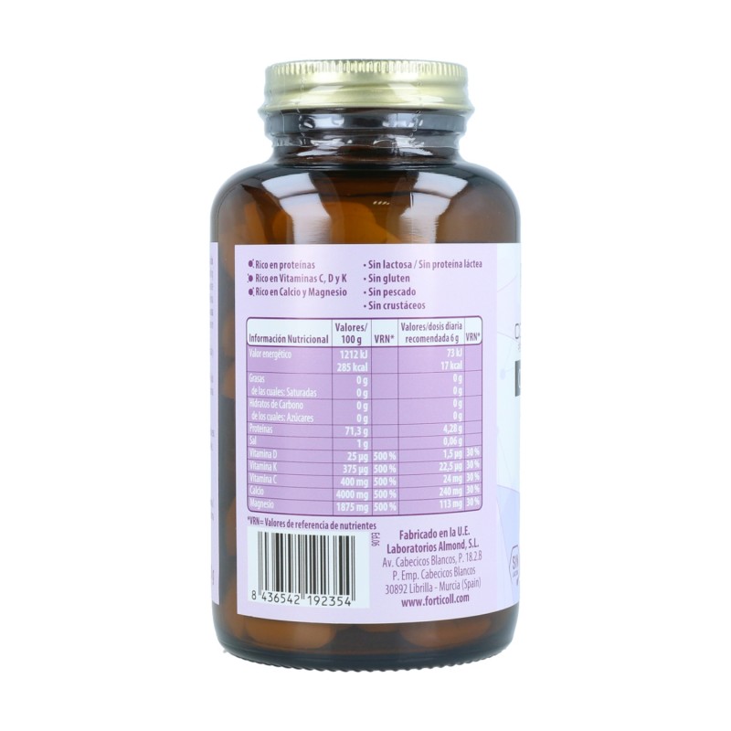 Información nutricional (por 100g): Valor energético 1.212Kj; Valor energético 385Kcal; Grasas 0,0g; Saturadas 0,0g; Hidratos de Carbono 0,00g; Azúcares 0,00g; Proteínas 71,30g; Sal 1,00g; Vitamina D 25,0ug; (500.00% VRN)Vitamina K 375,0ug; (500.00% VRN)Vitamina C 400,0mg; (500.00% VRN)Calcio 4.000,0mg; (500.00% VRN)Magnesio 1.875,0mg (500.00% VRN).