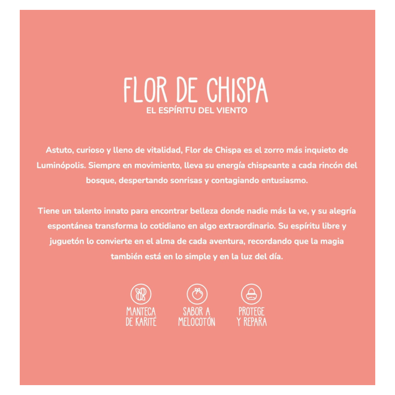 Su esencia dulce a melocotón envuelve como un soplo de aire fresco en verano, suave y reconfortante. La fórmula de su bálsamo hidrata intensamente y devuelve la vida a los labios, dejándolos radiantes, suaves y llenos de vitalidad. Flor de Chispa es esa chispa diaria que inspira, cuida y acompaña cada paso con energía positiva.