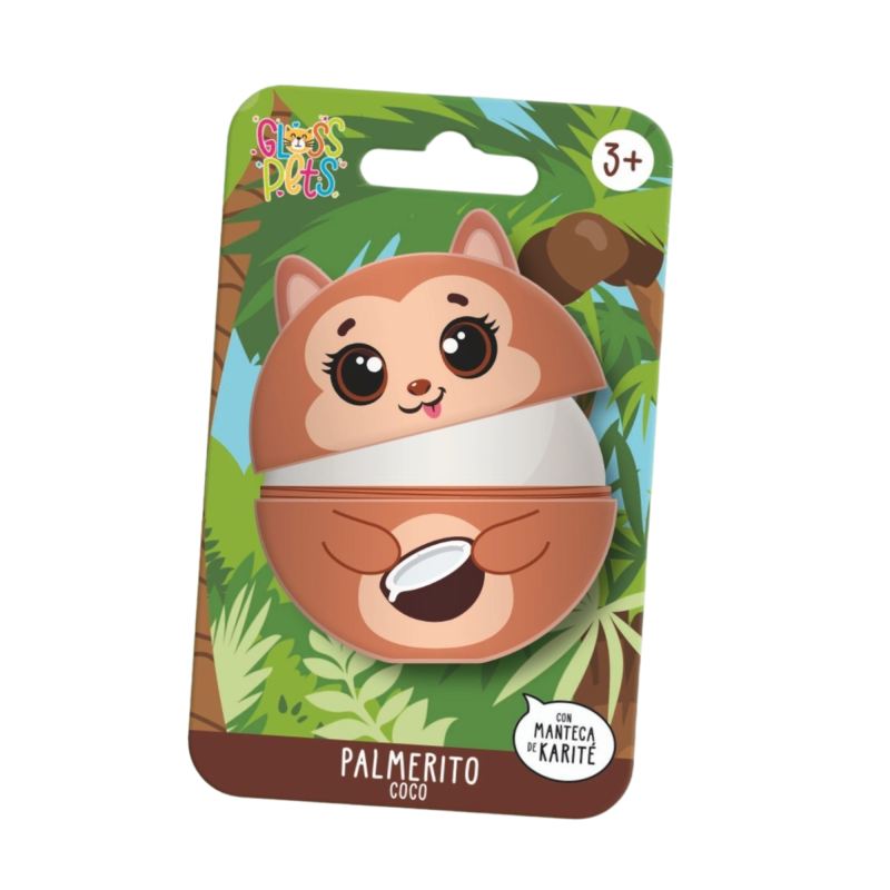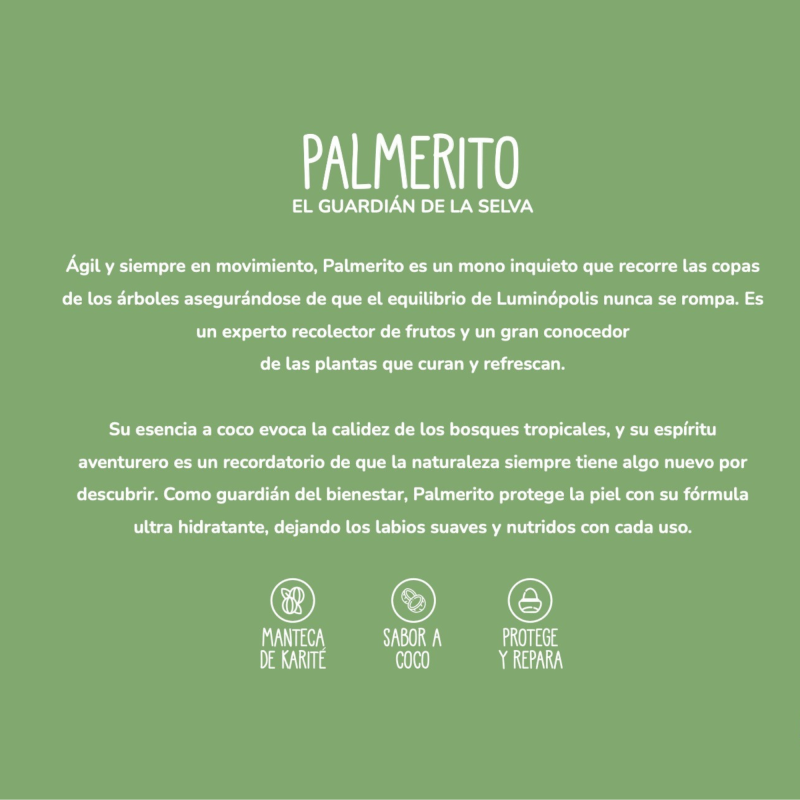Ágil y siempre en movimiento, Palmerito es un mono inquieto que recorre las copas de los árboles asegurándose de que el equilibrio de Luminópolis nunca se rompa. Es un experto recolector de frutos y un gran conocedor de las plantas que curan y refrescan. Su esencia a coco evoca la calidez de los bosques tropicales, y su espíritu aventurero es un recordatorio de que la naturaleza siempre tiene algo nuevo por descubrir. Como guardián del bienestar, Palmerito protege la piel con su fórmula ultra hidratante, dejando los labios suaves y nutridos con cada uso.