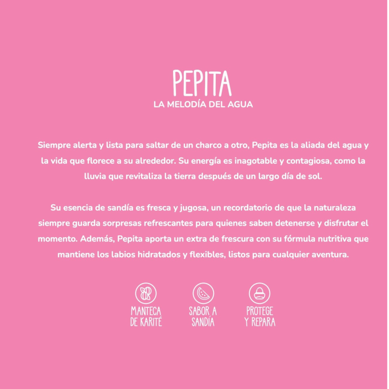 Siempre alerta y lista para saltar de un charco a otro, Pepita es la aliada del agua y la vida que florece a su alrededor. Su energía es inagotable y contagiosa, como la lluvia que revitaliza la tierra después de un largo día de sol. Su esencia de sandía es fresca y jugosa, un recordatorio de que la naturaleza siempre guarda sorpresas refrescantes para quienes saben detenerse y disfrutar el momento. Además, Pepita aporta un extra de frescura con su fórmula nutritiva que mantiene los labios hidratados y flexibles, listos para cualquier aventura.