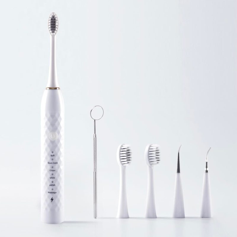 Cepillo eléctrico dental con accesorios, diseñado para proporcionar una limpieza profunda y eficaz mediante tecnología sónica, capaz de generar entre 32.000 y 38.000 vibraciones por minuto.