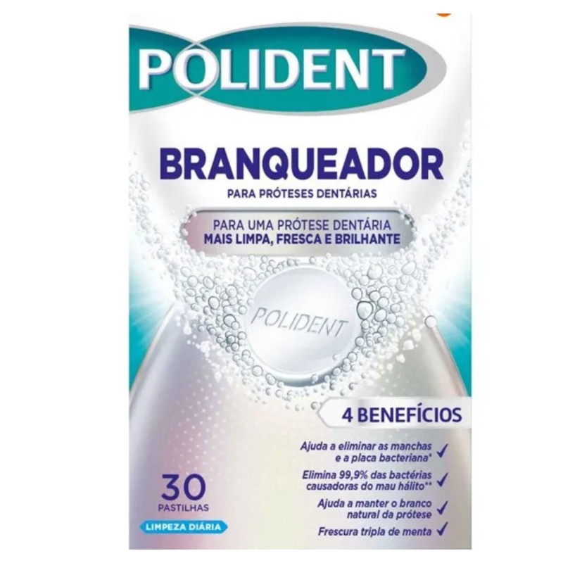 Pastillas blanqueadoras de Polident para prótesis dentales con acción desinfectante, que eliminan el 99,9% de las bacterias.