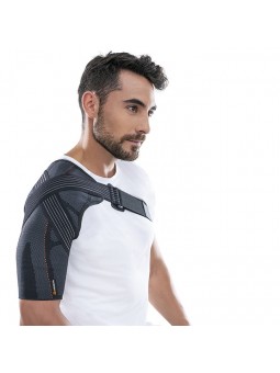 Soporte de hombro elástico y ajustable que ayuda a reducir los síntomas de ciertas lesiones, dolores y patologías en la zona del hombro, como por ejemplo la artritis, tendinitis, roturas o luxaciones de hombro. Fomenta la correcta alineación después de lesiones tipo dislocación o subluxación.