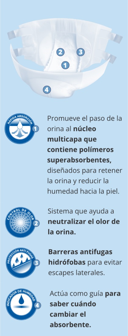 Son absorbentes anatómicos con elásticos que ofrecen una solución eficaz para la incontinencia moderada a grave.