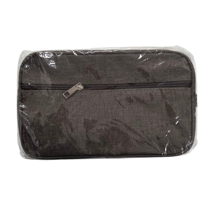Neceser de viaje en poliéster de color gris oscuro, pensado para garantizar una organización eficiente y un transporte cómodo de los artículos de higiene personal.