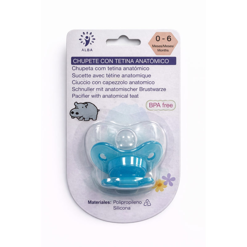 Chupete con tetina anatómica para bebés mayores de 0 a 6 meses.