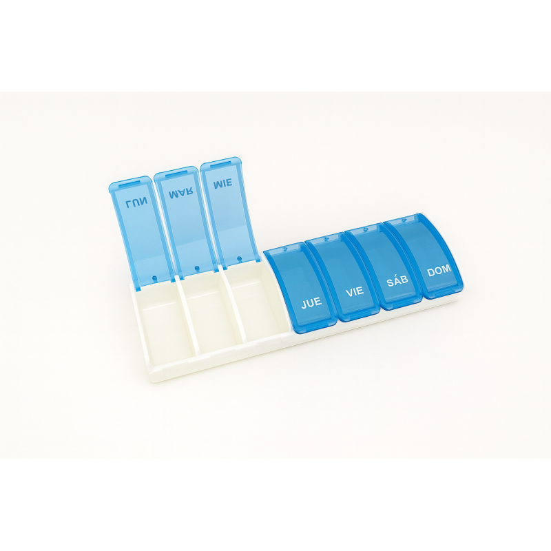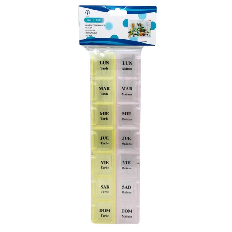 Pastillero semanal de 2 tomas diarias etiquetado con los días de la semana.