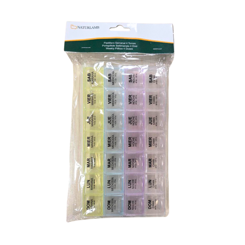 Pastillero semanal con 4 compartimentos, diarios, para la toma de medicación en el desayuno, comida, merienda y cena.