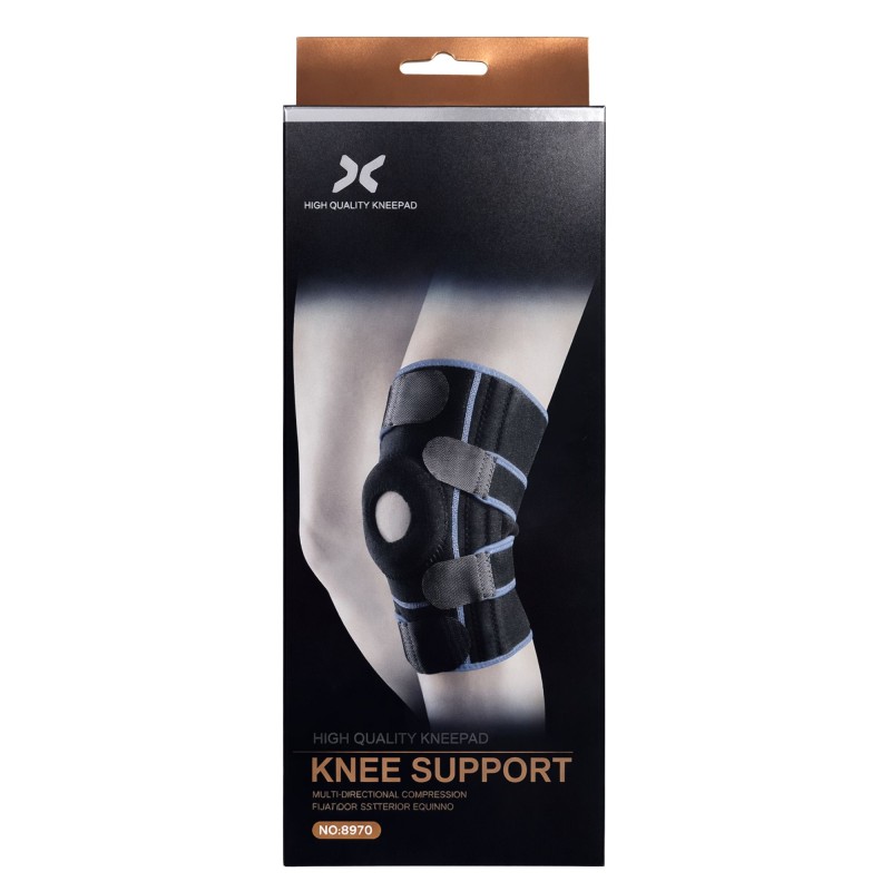 Rodillera con estabilizadores laterales y rótula abierta.