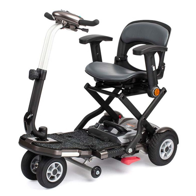 Cuenta con ruedas neumáticas que aportan mayor confort de marcha y permiten subir con facilidad bordillos. Con ruedas antivuelco (laterales y traseras) que garantizan la seguridad del usuario y con llave de seguridad en la batería.