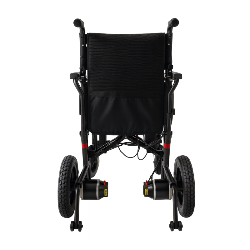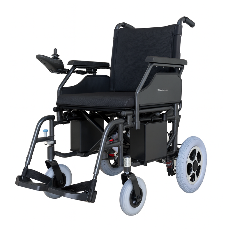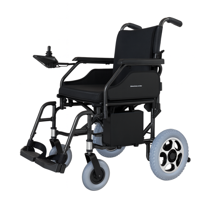 Ηermes es una silla de ruedas eléctrica con un asiento cómodo, plegable, con reposapiés ajustable y respaldo inclinable para facilitar su transporte y almacenamiento.