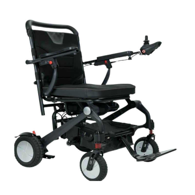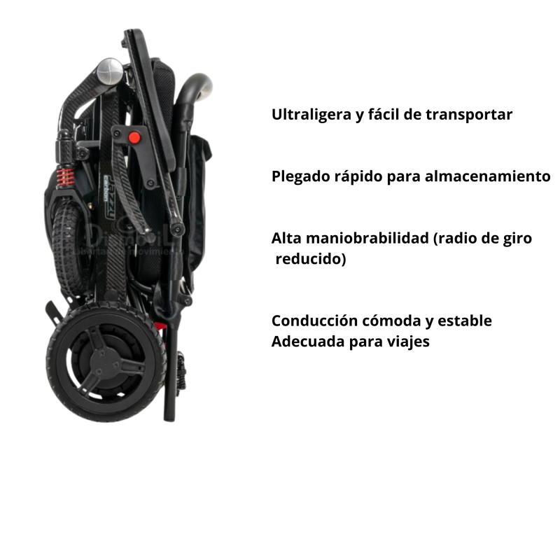 Silla de ruedas eléctrica JAZZY de última generación con chasis de fibra de carbono, diseñada para ofrecer una combinación óptima de ligereza estructural, resistencia mecánica y portabilidad. Su diseño plegable permite un transporte rápido y sencillo, mientras que su sistema de propulsión eléctrica proporciona una movilidad autónoma eficiente en entornos interiores y exteriores controlados.