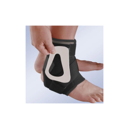 Tobillera de neopreno con sistema de estabilización mediante placas maleolares en termoplástico y cincha semirrígida.