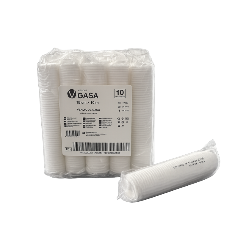 Venda de gasa orillada sin elasticidad y formado por un tejido de punto orillado, esto permite que la venda no se deshilache por los laterales.